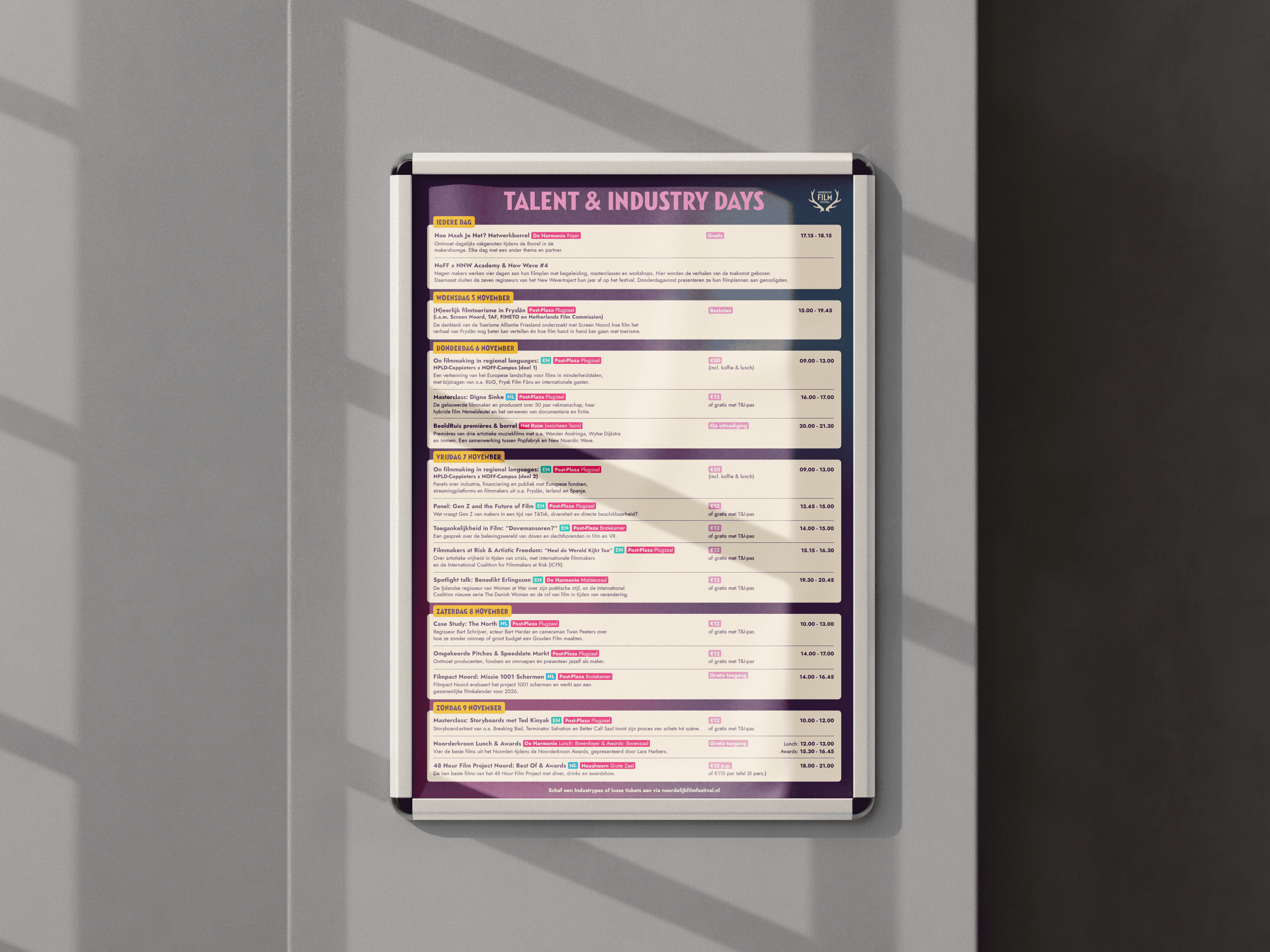 Daaronder valt de signing de vlaggen (van drie meter hoog, die de bezoeker statig laten weten: het is tijd), de menukaart en de kaart voor de borrelhapjes, een fotowand, om de bezoeker een aandenken aan de avond te geven, en de poster voor het Talent & Industry programma.